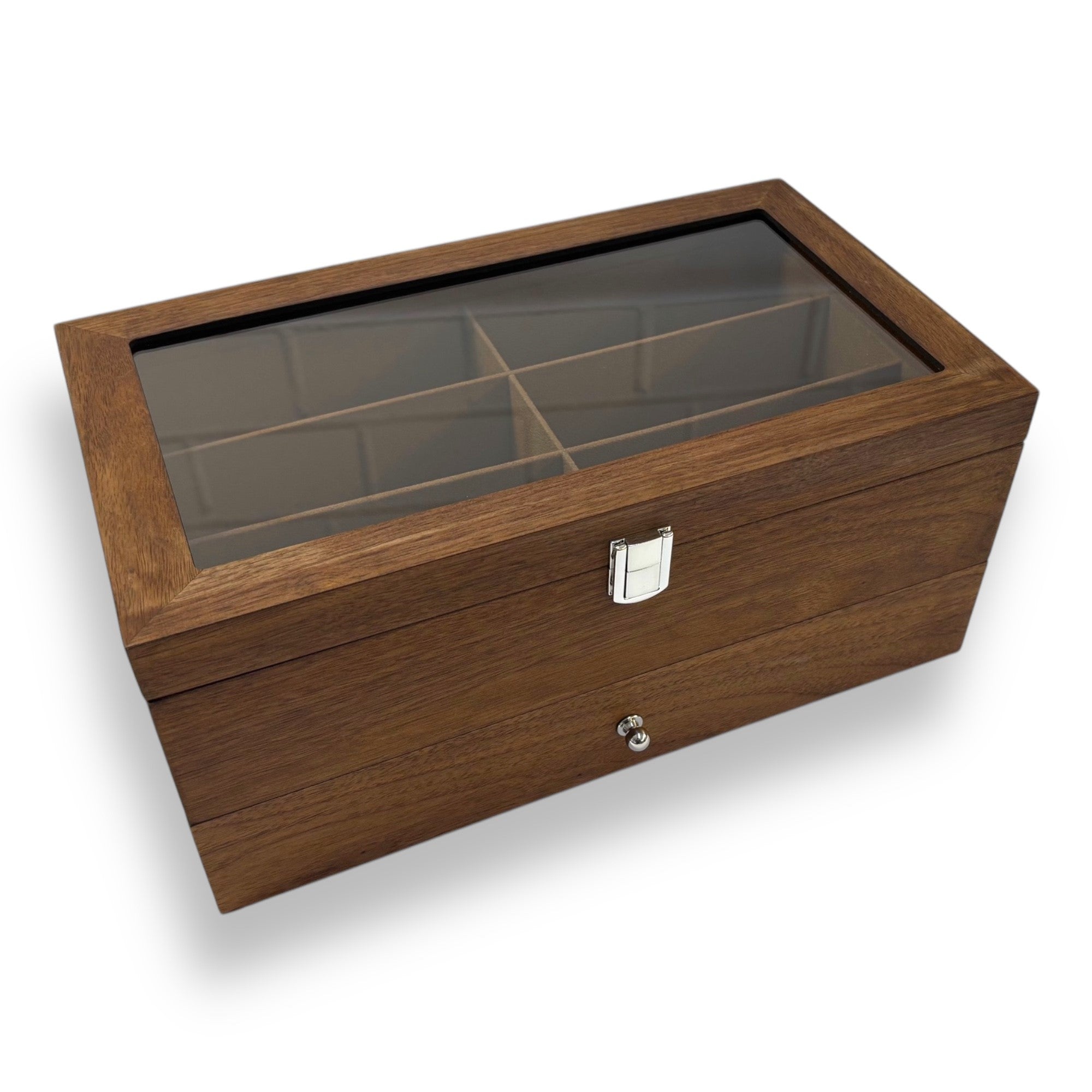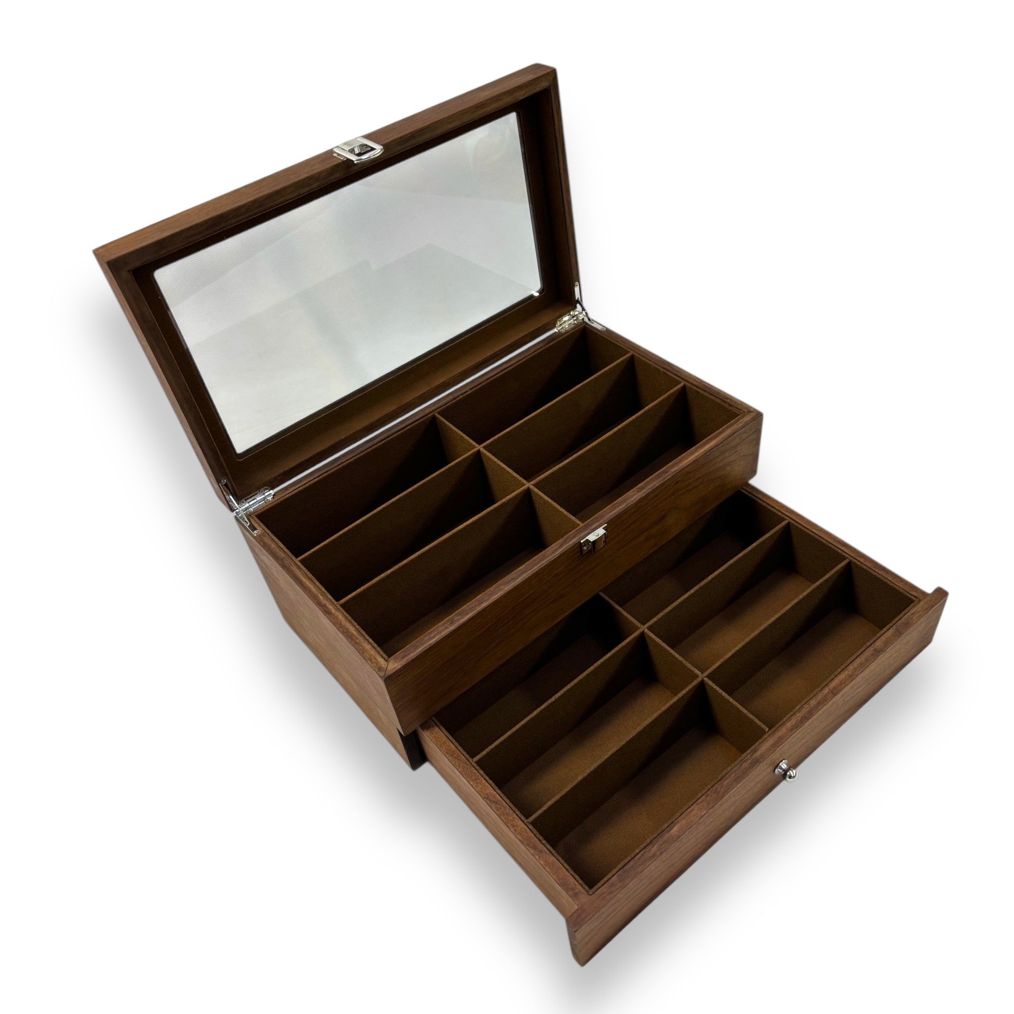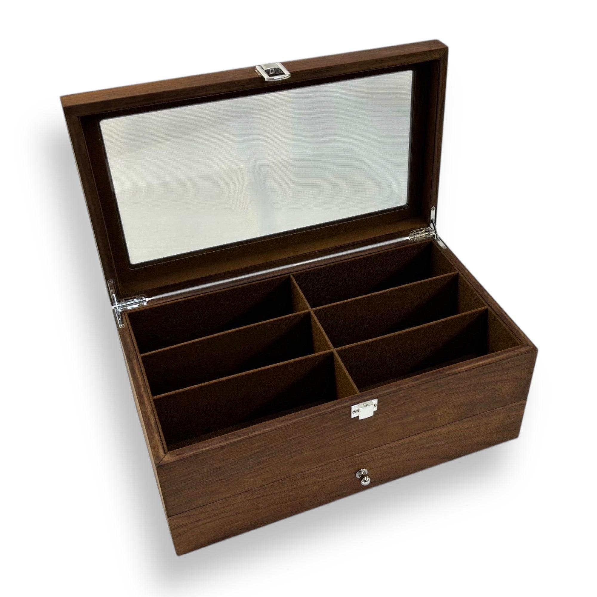 Brillenbox Modell 2052 34.5 x 15 x 20 cm Farbe: braun echt Holz Brillenaufbewahrung Brillenbox zur Aufbewahrung von 12 großen Brillen mit Sichtfenster aus Kunststoff und Schublade Innen mit braunen Velour ausgeschlagen. Boden mit schwarzen Flies verkleidet. Fach Größe: 16 x 6 x 5,5 cm / 15 x 5 x 5,5 cm Produktgröße: 34.5 x 15 x 20 cm Verpackungsgröße: 41 x 27 x 22cm Bruttogewicht: 2,8 kg
